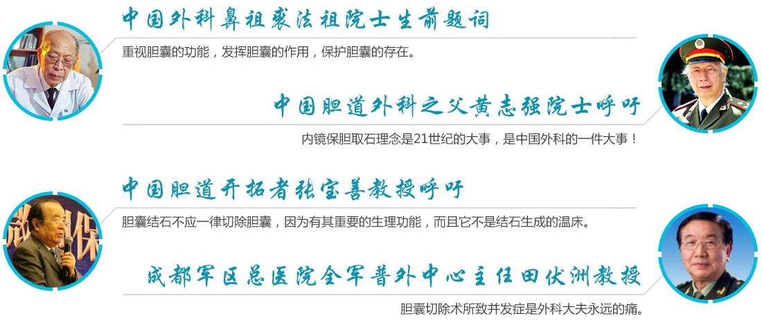 中国的保胆事业是历尽艰辛的发展历程,众多权威胆道外科专家为推进保胆取石工作,呕心沥血:裘法祖、黄志强、冉瑞图、张宝善、田伏洲等前辈们对保胆的卓越贡献,他们创建和提倡的理论思想体系,实践经验以及科学精神是中国胆道外科的精神财富和动力源泉,使中国保胆不仅没有像老式保胆那样自生自灭,反而像燎原烈火,越烧越旺。